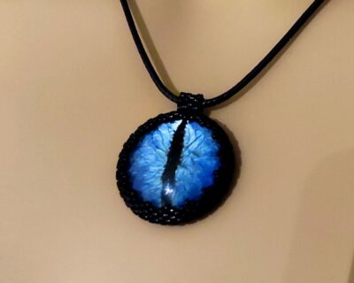 - Na sklenený kabošon som ručne namaľovala dračie oko v modro - čiernej farbe. Kabošon som obšila sklenenými Japonskými korálkami Miyuki, ktoré majú 1 a 2 milimetre. Prívesok je zavesený na koženej retiazke. Dĺžka retiazky - 43 cm + 5 cm predlžovacia retiazka. Priemer prívesku - 3 cm Tento jedinečný nadčasový šperk si v bežnom obchode určite nekúpite. Keďže každé oko …