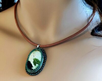 Šitý prívesok z Chalcedónu zeleného s retiazkou z pravej kože