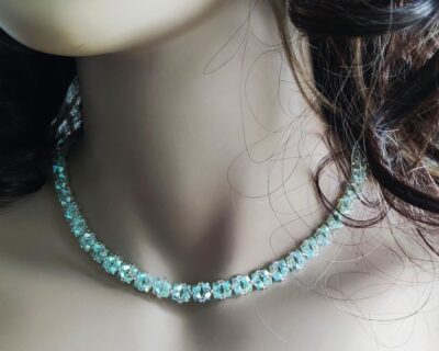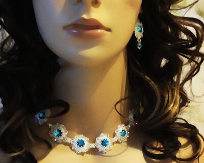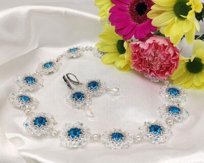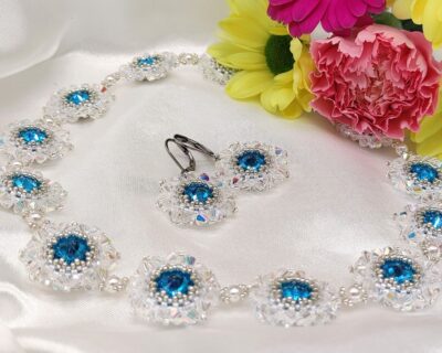 - Dizajn: Autorský šperk s kvetinovým vzorom Materiál: Brúsené sklenené kryštály Preciosa v modrej a Crystal farbe, kvalitný rokajl Miyuki Spracovanie: Precízna ručná práca technikou šitého šperku. Vhodné pre: Nevesty („niečo modré“), spoločenské udalosti, luxusný darček. Dĺžka náhrdelníka : 33 cm + 4 cm predlžovacia retiazka Priemer obšitého kryštálu : 2,5 cm Náhrdelník môžete nosiť ako obojkový alebo klasický do výstrihu. Náhrdelník vám…