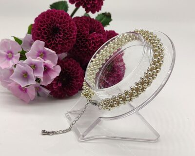 - Náramok som spravila zo sklenených perál priemer 8 mm s vysokým leskom. Zapínanie: Ozdobná spona s bezpečnostným mechanizmom, pozlátená, zdobená mikro-zirkónmi. Vzhľad: Jemný, romantický a vysoko elegantný. Náramok je na obvod zápästia 15 až 16 cm.