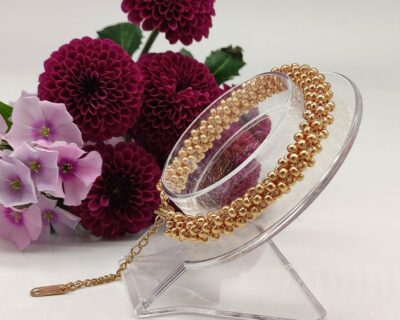 - Materiál: Japonské sklenené korálky Miyuki (zlatý pokov). Technika: Ručné šitie (beadweaving). Zapínanie: chirurgická oceľ pozlátená Dĺžka: 17 cm + č cm predlžovacia retiazka Náramok môžem ušiť aj v inej farbe a dĺžke. Pri inej dĺžke sa môže cena mierne navýšiť. Prosím kontaktujte ma mailom.