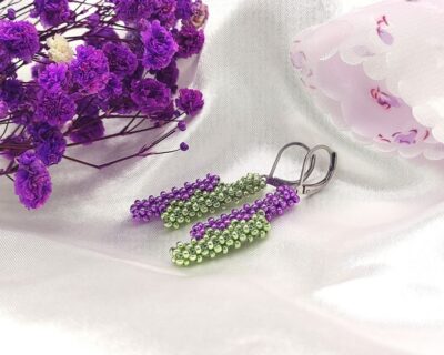 Šité náušnice vo fialovej a hráškovo zelenej farbe