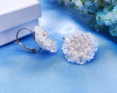 - Náušnice som ušila z Preciosa Crystal a Japonských sklenených Miyuki korálok v bielej a striebornej farbe. V centre náušnice je nádherný Crystal Ice. Náušnice vám môžem ušiť aj v inej farbe. Prosím kontaktujte ma na mirka@amirahandmade.com Priemer náušnice spredu : 2,5 cm K náušniciam si môžete objednať prsteň, náramok, náhrdelník alebo sponu do vlasov. Šperky balím do darčekových krabičiek s mojím logom…
