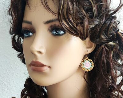 Šité luxusné náušnice v zlato ružovej a zelenej farbe