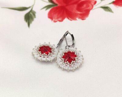 Šité náušnice z kryštálov v červeno bielej farbe – chirurgická oceľ