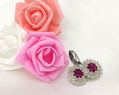 Šité náušnice v striebornej farbe v kombinácii s Fuchsia farbou