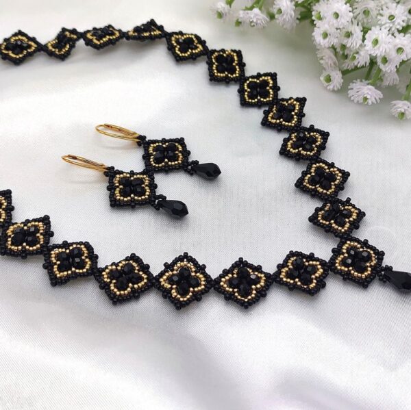 Ručne šitý elegantný luxusný zlatočierny náhrdelník zo sklenených brúsených korálok Black a Japonských korálok Miyuky.