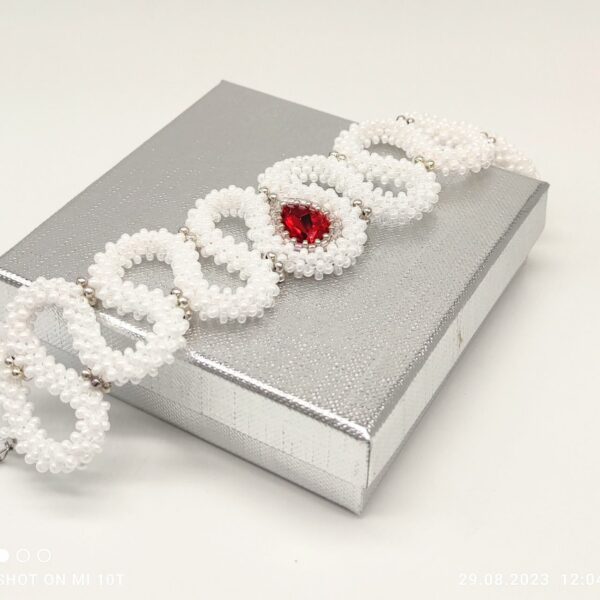 Korálky majú 2 mm, každú korálku prešívam minimálne 2x a preto mi výroba šperku trvá hodiny niekedy dokonca aj dní.
