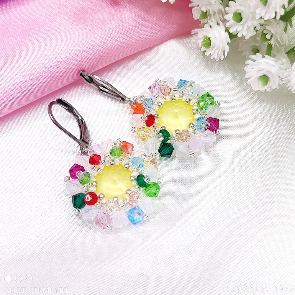 Tieto originálne farebné náušnice som ušila z Preciosa kryštálov a Japonských sklenených Miyuki korálok. V strednej časti je obšitý kryštál v žltej farbe .