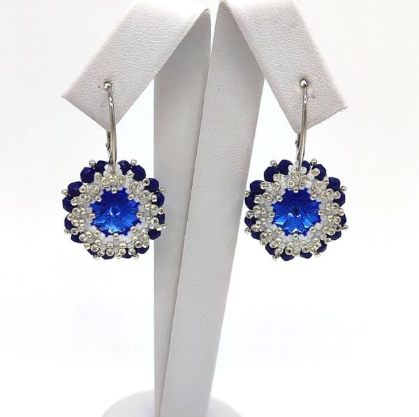Vstúpte do sveta kráľovskej elegancie s náušnicami, ktoré kombinujú hlbokú modrú s jemným strieborným odleskom. Stred náušníc tvorí brúsený sklenený kryštál Preciosa Sapphire, ktorý je precízne obšívaný drobnými rokajlovými korálkami Miyuki. Vonkajší lem z brúsených bicone korálok dodáva šperku geometrickú čistotu a kvetinový nádych.