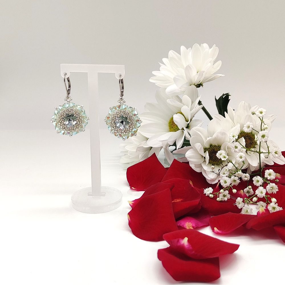 Ručne šité náušnice zo Swarovski a Preciosa kryštálov Indicolite s AB efektom a Japonských sklenených korálok Miyuki a Toho.