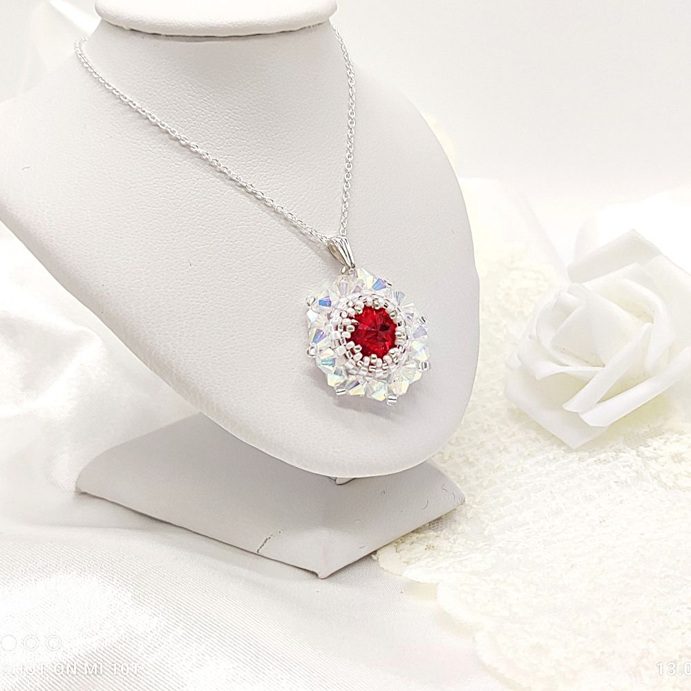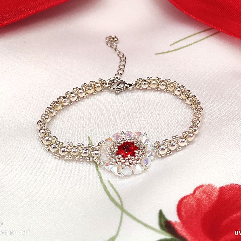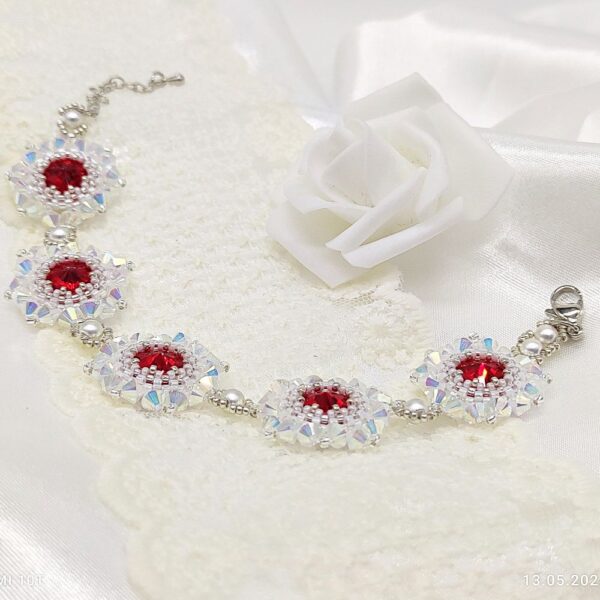 Originálny šitý náramok z kryštálov v červeno bielej farbe