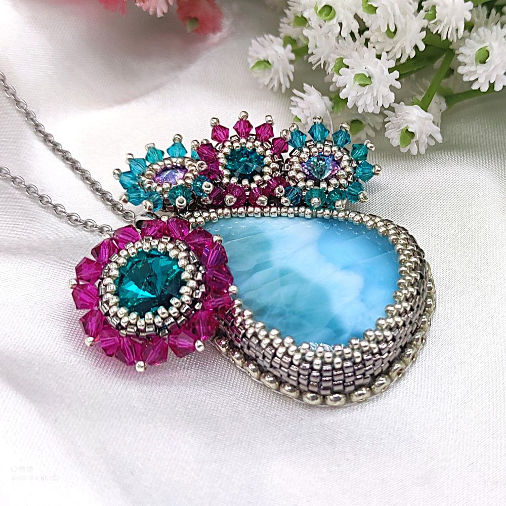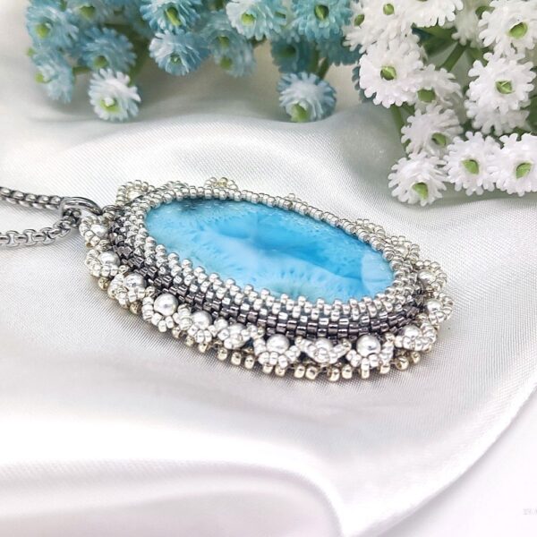 Originálny šitý prívesok z polodrahokamu LARIMAR a perál