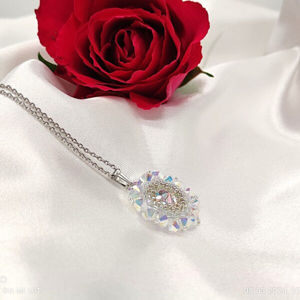 - Poctivé ručné šitie: Prívesok je vytvorený technikou šitého šperku, kde je každý kryštál a korálik pevne zapracovaný do harmonického celku.