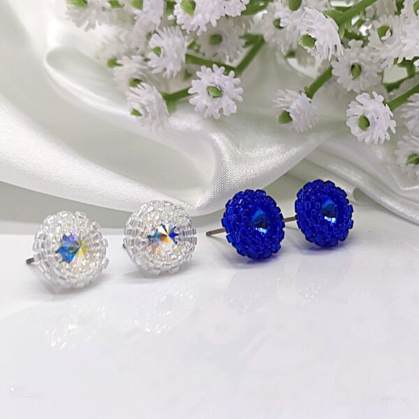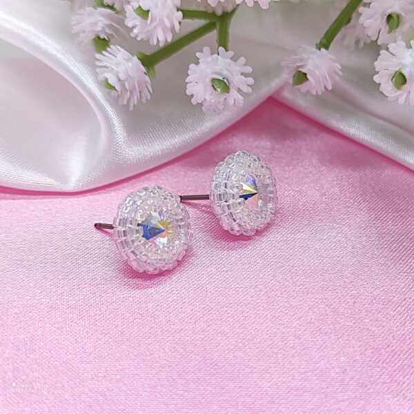 Dodajte svojmu dňu štipku luxusu a jemného trblietania. Tieto ručne šité náušnice sú vytvorené precíznou technikou obšívania stredového kryštálu. Použitý odtieň „Crystal AB“ vytvára nádherné dúhové odlesky pri každom pohybe hlavy, vďaka čomu sú náušnice neprehliadnuteľným, no stále decentným doplnkom.