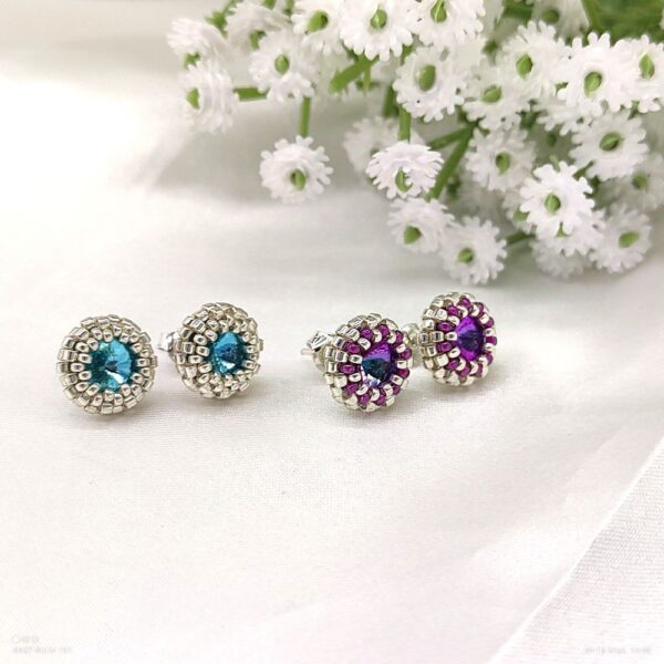 Doplňte svoju zbierku šperkov o kúsok, ktorý vyžaruje energiu a ženskosť. Tieto ručne šité náušnice v podmanivom odtieni fialovo ružovej sú stelesnením precíznosti a elegancie. Brúsený stredový kryštál zachytáva svetlo pri každom pohybe, zatiaľ čo strieborné olemovanie mu dodáva moderný a luxusný vzhľad.