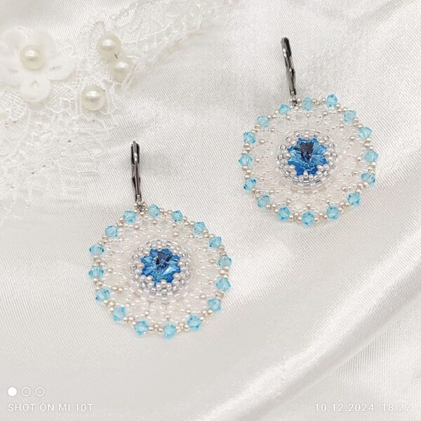 Náušnice som ušila z Preciosa Crystal Aquamaríne v modrej farbe a Japonských sklenených korálok Miyuki v bielej a striebornej matnej farbe.