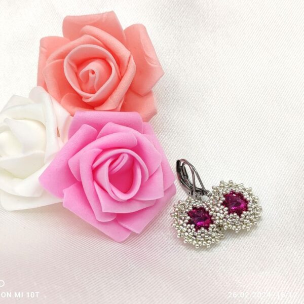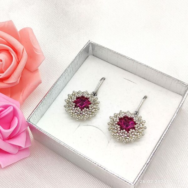 Šité náušnice v striebornej farbe v kombinácii s Fuchsia farbou