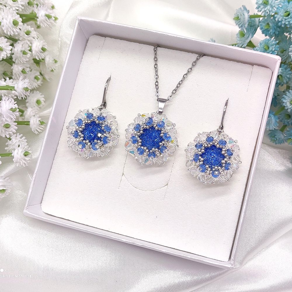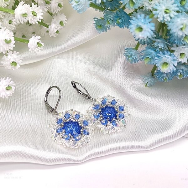 Náušnice som ušila z Preciosa kryštálov v nádhernej nebesky modrej farbe a farbe krištáľu. Japonských sklenených korálok v striebornej farbe.