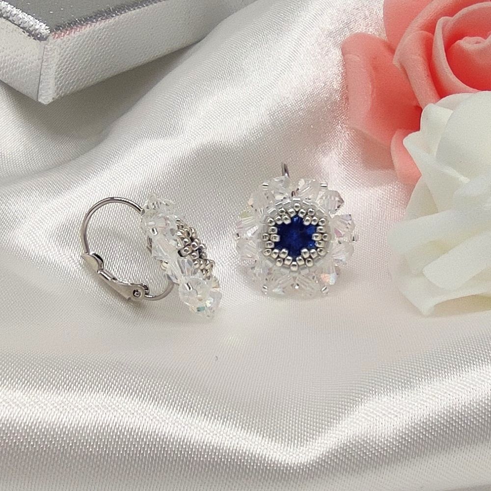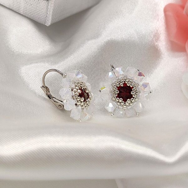 Náušnice som ušila z Preciosa Crystal White Opál s AB efektom a Japonských sklenených Miyuki korálok v striebornej farbe. V centre náušnice je kryštál v nádhernej krvavo červenej farbe .