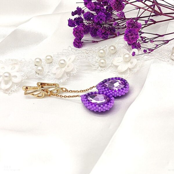 Šité náušnice z kryštálov v tvare kvapky vo fialovo zlatej farbe