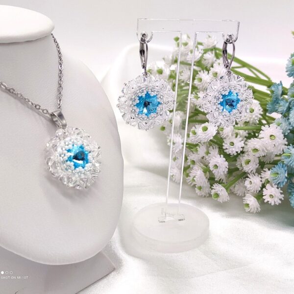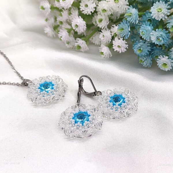 Šitý prívesok a náušnice v krištáľovej a nebesky modrej farbe